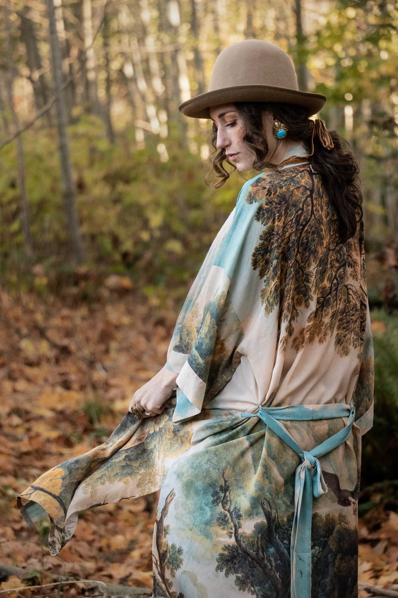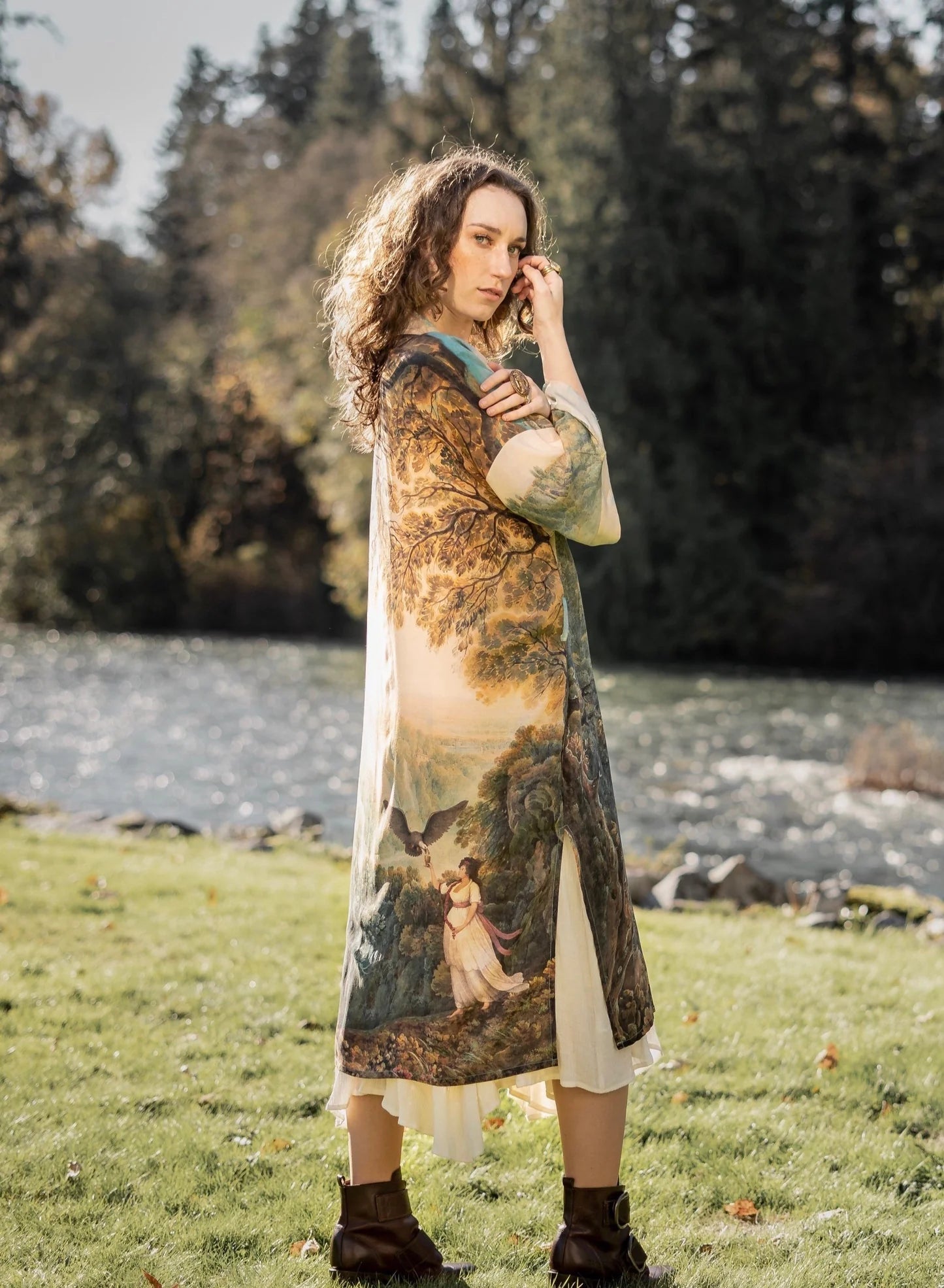 Created to embrace the transformative power of self love and awareness, this stunning kimono combines two magical pieces of art: a lush landscape of the waterfalls at Tivoli, Italy, painted by artist Louis Ducros in 1790, and an antique engraving depicting Lady Liberty created by E. Savage in 1796. We married them together to produce a rich, beautiful vision of a woman confidently stepping in to her own power. The painterly palette is feminine, romantic, and strong.