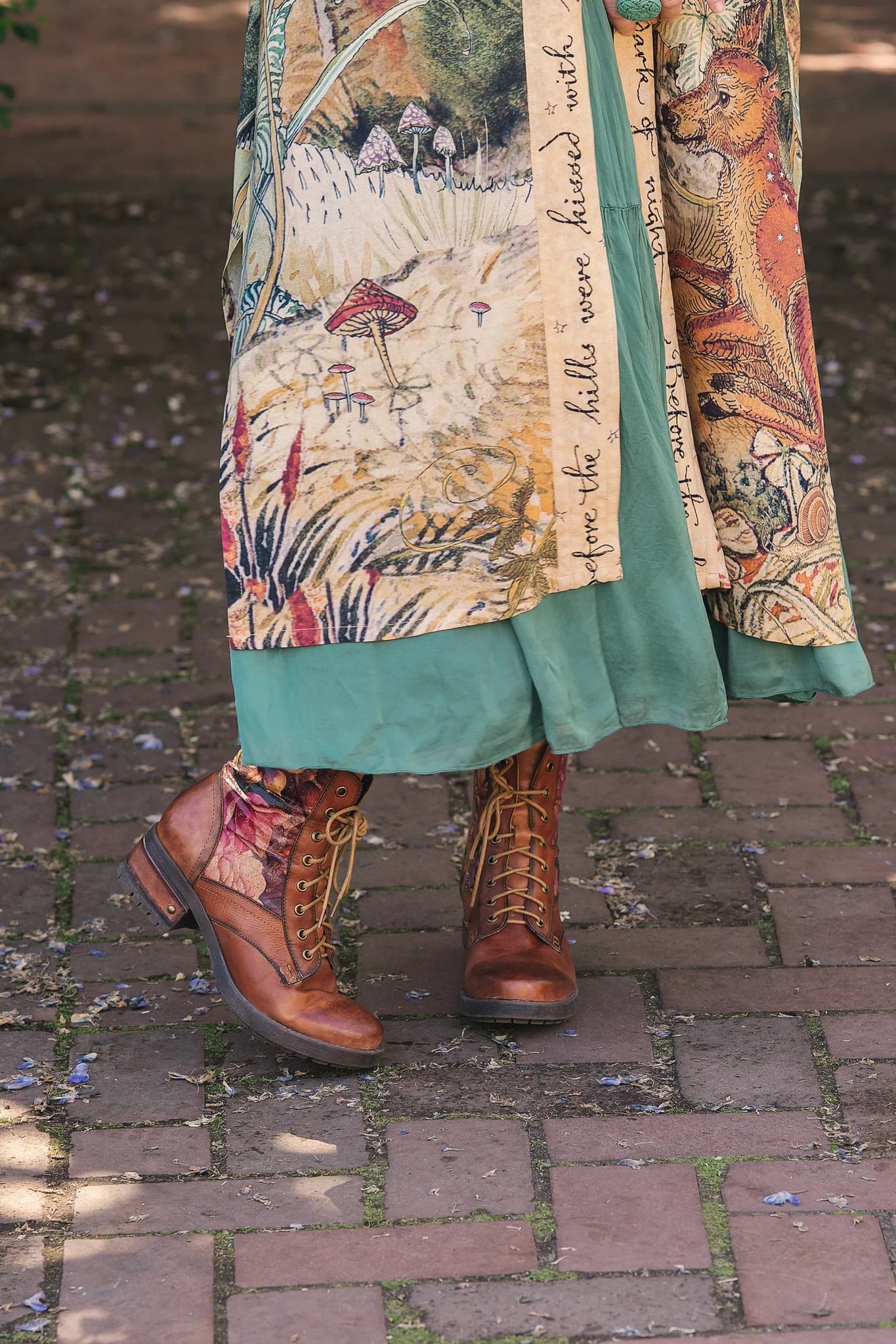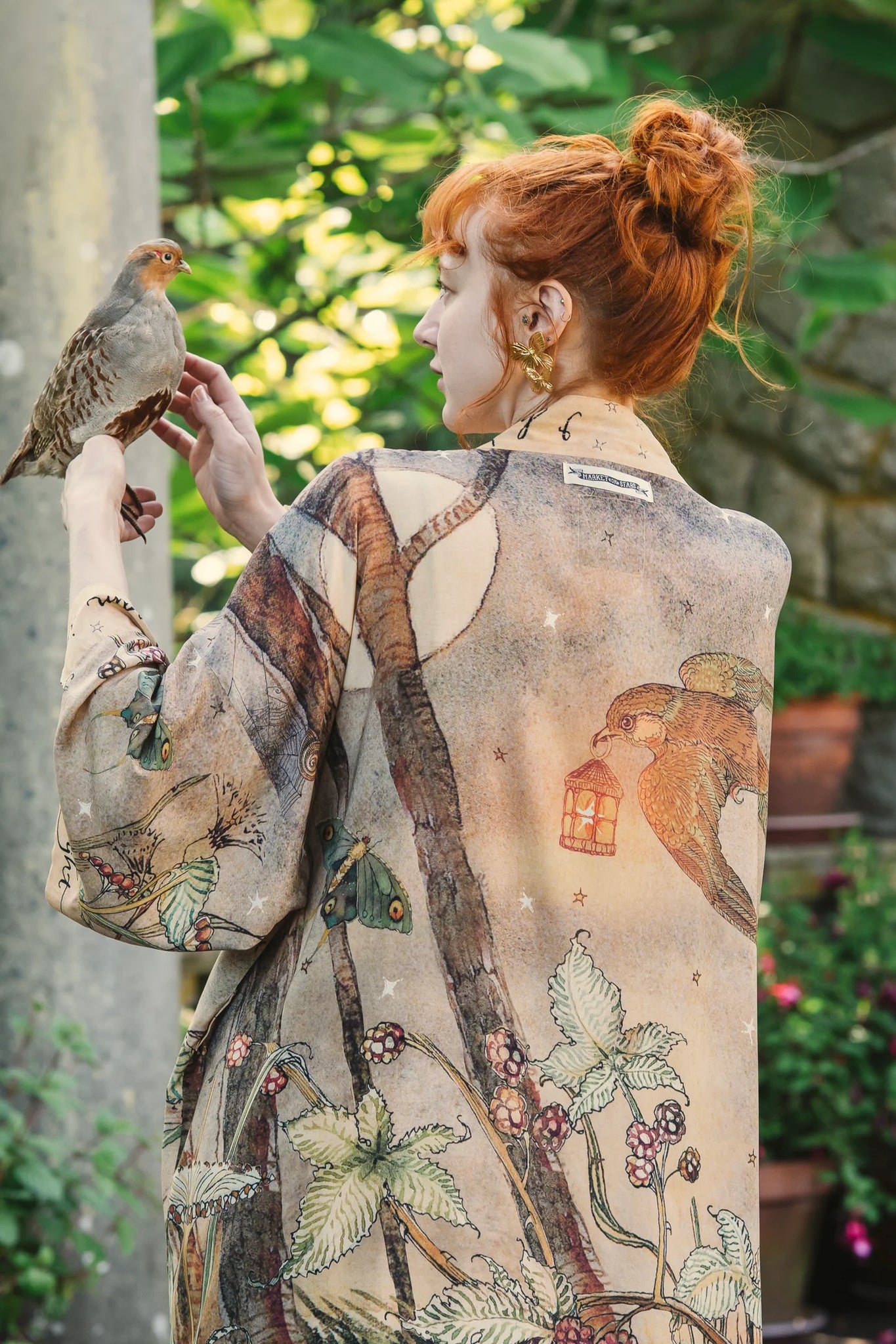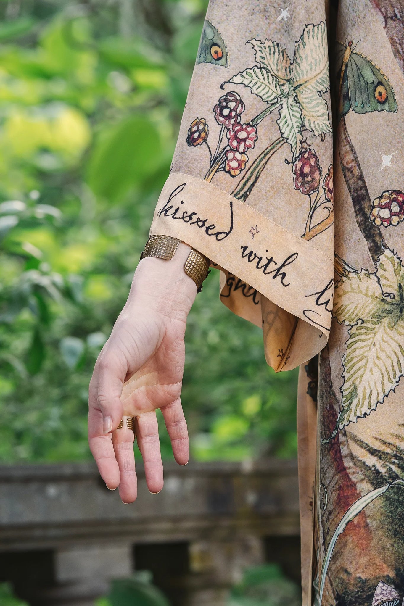 Lovelight was created using a collage of several pieces of Charles’ work, including a majestic guardian swallow carrying a lantern that cradles a glowing star, a delicate watercolour moth, and a star-dappled fawn nestled in the moonlit woods. The whole collection is edged with a piece of poetry by van Sandwyck, which wraps the wearer in words as soft as the dawn: I had a dream in dark of night, before the hills were kissed with light.